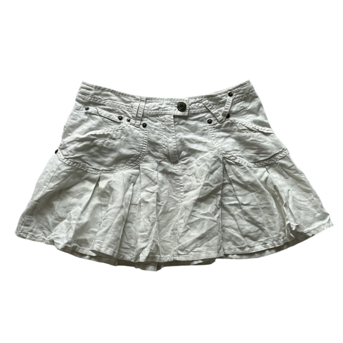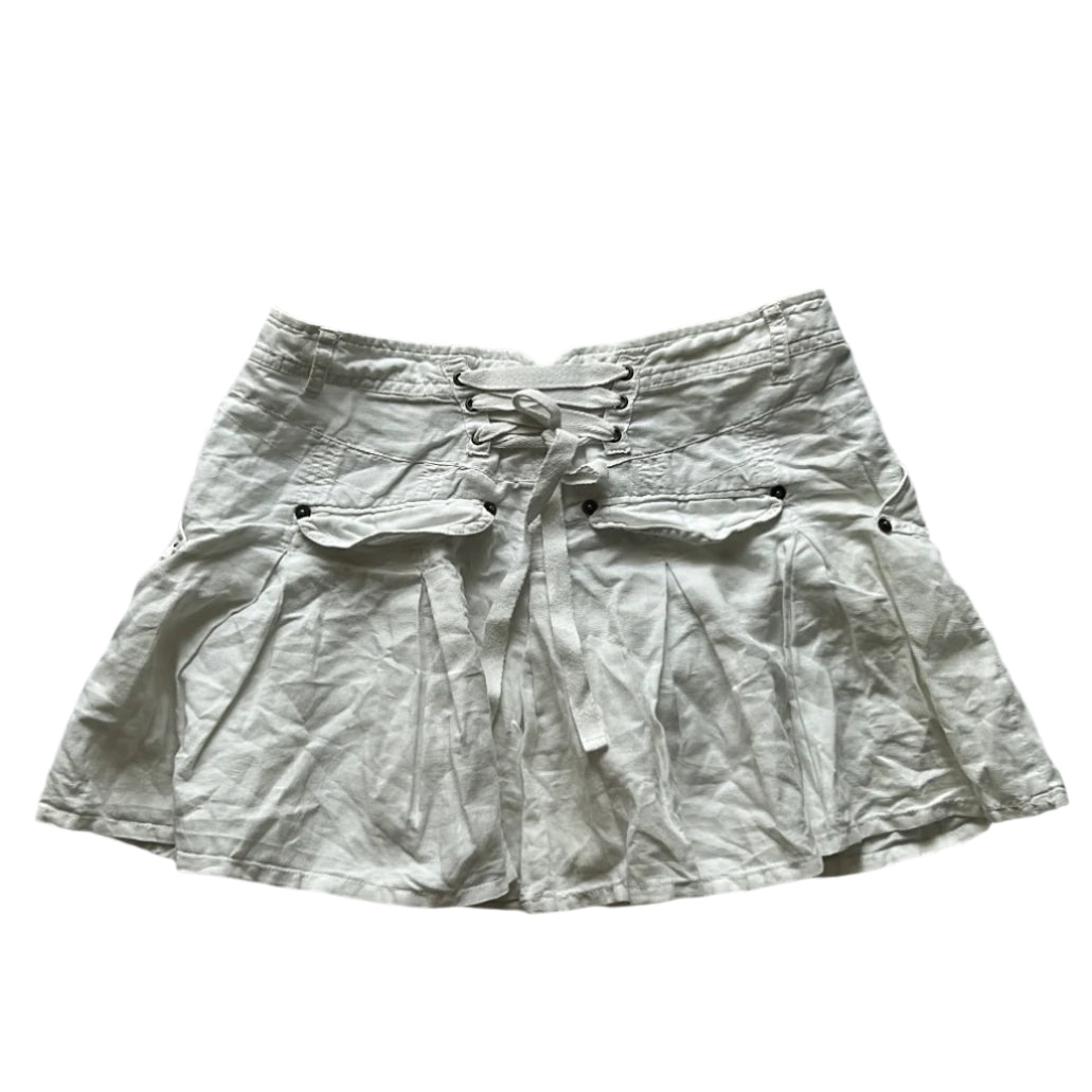white pleated mini skirt with corset like adjustable detail on the back